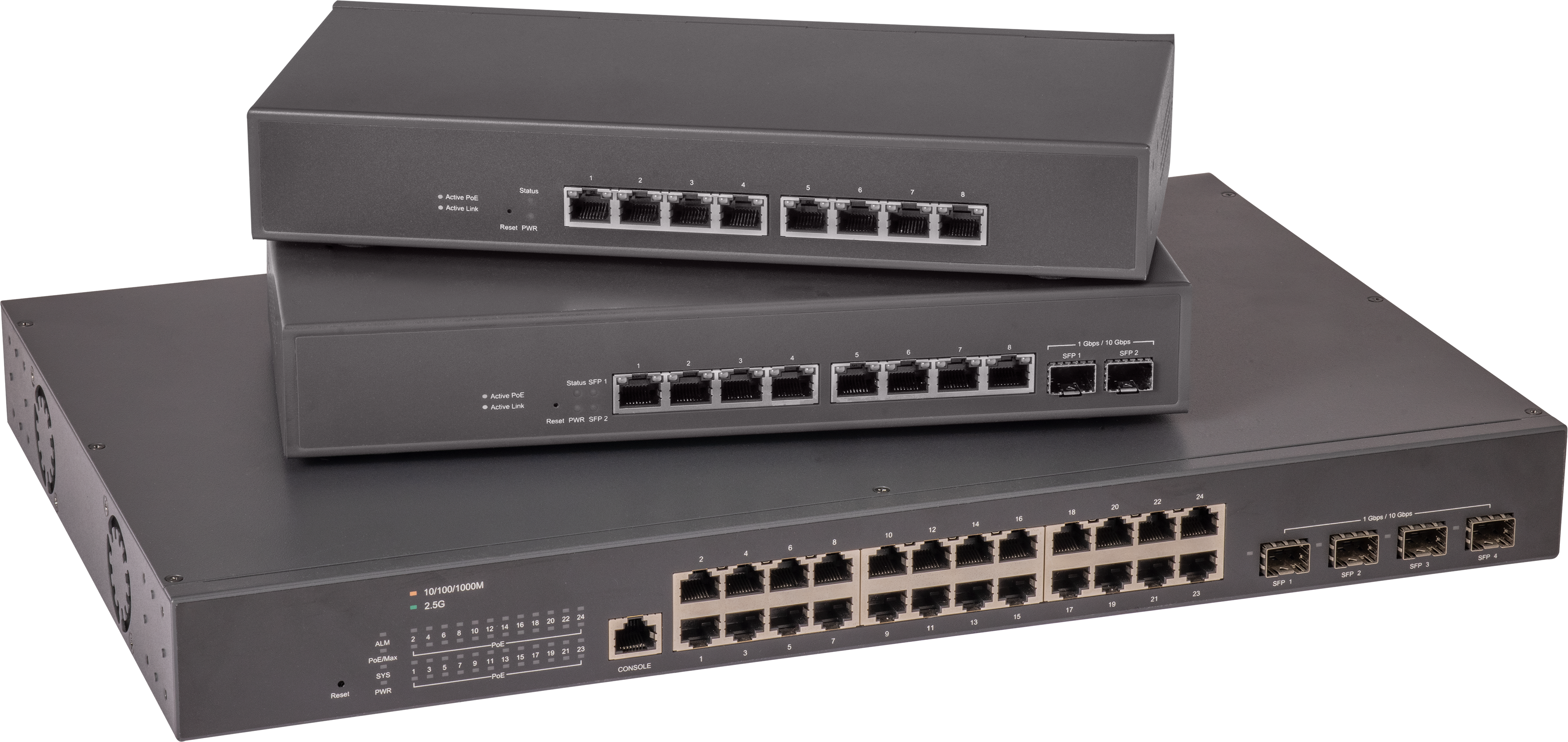 Die PSX-Serie umfasst drei neue Multi-Gigabit PoE Switch-Modelle: PSX8, PSX10 und PSX28. Alle Modelle bieten 2,5G-Ethernet-Ports. Die PSX10- und PSX28-Modelle verfügen zusätzlich über 10G-SFP+-Uplinks für schnelle Glasfaser-Anbindungen.