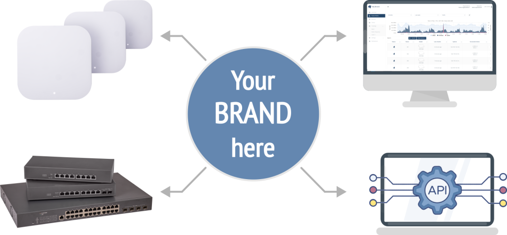 - Gebrandeten WiFi Access Points, PoE Switches, Media Convertern und einer Management Console